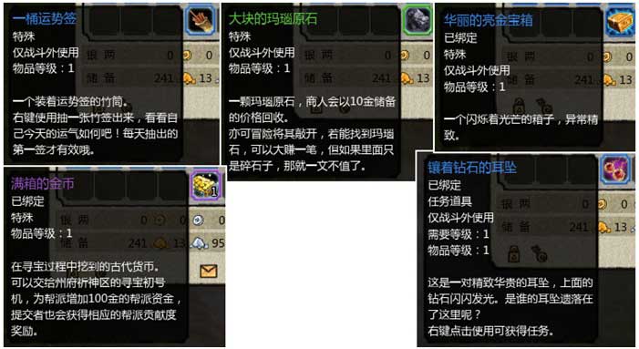 可能挖掘出的特殊道具:一桶运势签;大块的玛瑙原石;满箱的金币;镶着钻石的耳坠;华丽的亮金宝箱华丽的亮金宝箱有机会获得: 珍禽元丹碎片;宝宝探险徽章;宠物晶石;蟠桃;幻之荆州团子;奇迹荆州团子;黑耀矿石;辉光水晶;变化的角笛;异化的角笛等等