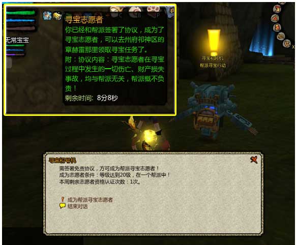 1. 要想参与帮派寻宝活动,首先需要找到州府祈神区的“寻宝初号机”,签署一份协议,成为帮派寻宝志愿者。完成志愿者协议签署任务后,玩家就可以获得一个buff,持续一小时。拥有此buff,玩家才能领取帮派寻宝行动的任务。