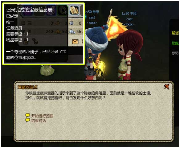 2. 领取完buff成为帮派寻宝志愿者后,玩家就可以到寻宝初号机旁边的章赫磊处领取帮派寻宝任务了。领取任务后不能传送,自动寻路到任务目标点,可以看到一个小土堆,点击挖掘宝藏后,就有几率挖到各种宝藏、遇到各种事件了。有时候会遇到奇怪的战斗,有时候会遇到各种事件,当宝藏标记器将宝藏信息记录后,就可以直接在挖掘点这里交付任务了。