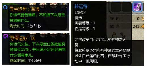 4. 寻宝运势:每次交付完寻宝任务后,会获得一个寻宝运势buff,这个buff会影响玩家下次寻宝任务的收益,如果运气好的话,还有几率遇到特殊的宝藏事件呢!当然,运气不好也会倒霉……不过,在寻宝过程中有几率挖到特殊的转运符,有了它就可以改变自己的运势,逢凶化吉了!